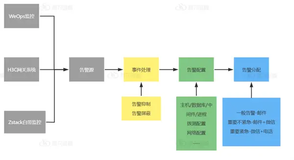 构建统一的告警中心,避免告警潮汐:接入zstack和H3C(网管系统)的告警信息到WeOps平台,实现告警统一展现,支持对告警进行收敛,避免告警潮汐。