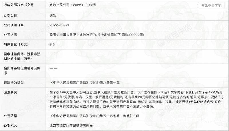 北京市海淀区市场监督管理局认为,饿了么的视频广告中关于新用户首单1元优惠,以及炸鸡、汉堡、披萨通通1元就能吃的内容,把概率事件描述为必然结果的问题,存在发布的广告不清楚、不准确,违反了《广告法》第八条第一款。10月21日,北京市海淀区市场监督管理局责令饿了么改正上述违法行为,并处罚款9万元。