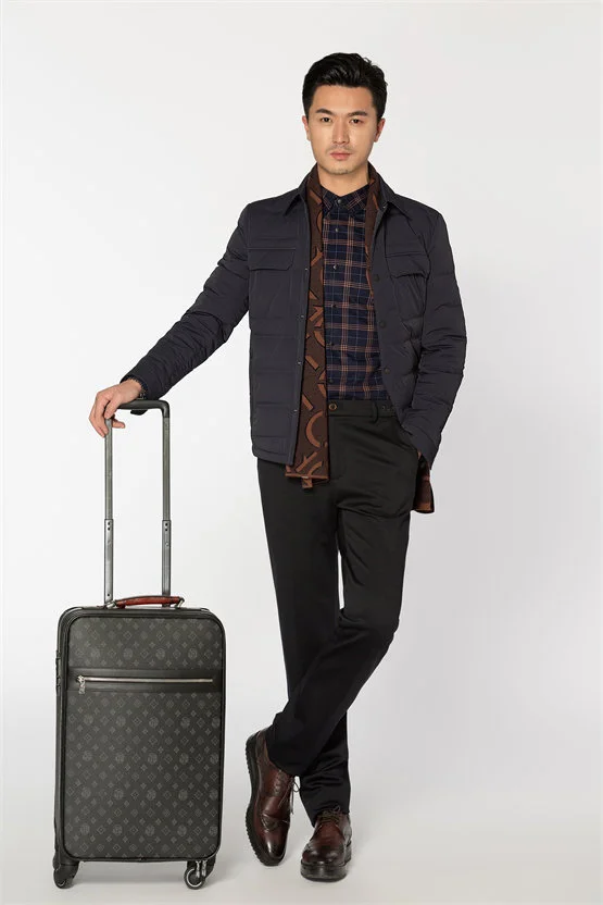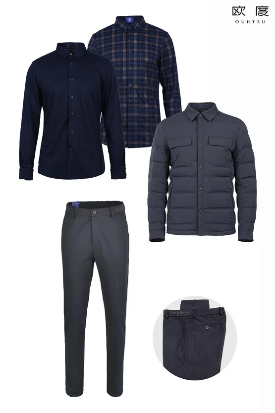 从单品款式来说,欧度这件衬衫夹克版型羽绒服线条简洁流畅,既符合商务干练氛围,又保证了温度。内搭是一件藏蓝与橙配色的双面穿抗皱衬衫,修身保暖耐磨实穿,格纹面和净色面足以应对商休场合。差旅出行时可以增加带有橙色元素的围巾做配饰,更能体现搭配时尚感。