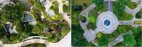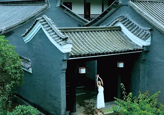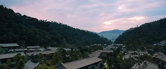 酒店依山而建,就地取材,青石青砖青瓦,隐于林中交相呼应,寄情山水,与自然为友,将生态康养发挥淋漓,倾心打造中国一流生态康养目的地。整体建筑设计古朴自然,红门铜锁、青砖碧瓦,而园林水榭又为这份禅静增添了一分灵动。通过充满创意和灵性的艺术布局,打造了一个既充分融合当地文化又不失现代雅致的世外桃源。