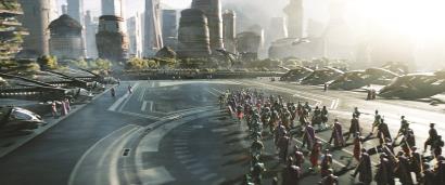 但是,人物前史的叙述和世界观的拓展,也为观众带来了不小的认知负担——相比于一个已经熟悉的漫威宇宙,新的人物和新的假定世界对创作来说既是机遇,也是危险。体现在《黑豹2》中,是影片时长的过度增加带来的观影疲惫。体现在《蚁人3》中,则是庞大世界观设定之下却最终讲述出一个简单的家庭童话和父女和解。影片对于整个系列的世界观设定的功能和影片自身的主题表达之间落差过大,降低了故事本身应有的戏剧性强度和主题深度。例如,在《蚁人3》的高潮段落,蚁人的女儿凯茜劫持了无线通讯,向受到压迫的量子领域的“原住民”们发出号召,弱小的人们爆发出巨大的勇气,不惧牺牲地参与到对征服者康的最后决战中。这一场景和《星球大战外传:侠盗一号》十分类似,但所产生的艺术效果有天壤之别:相比于后者因勇气和牺牲所带来的情感震撼,《蚁人3》中的这个段落就显得浮皮潦草、仅服务于热闹的奇观场景和蚁人父女最终的携手胜利。