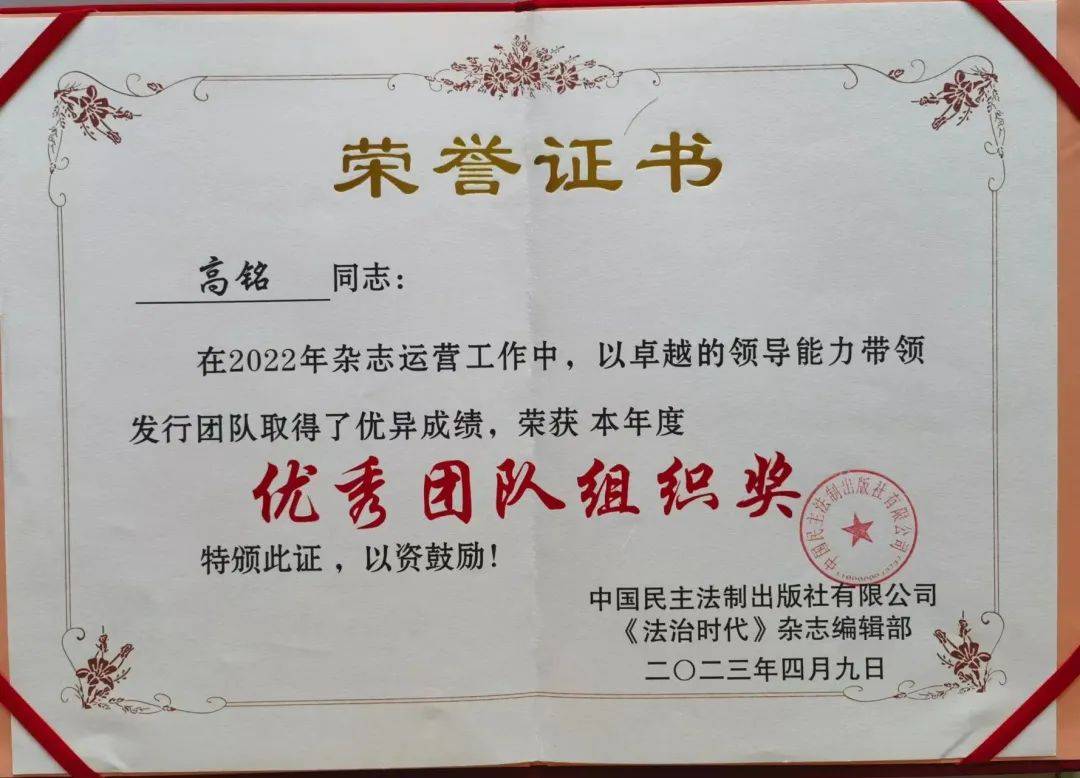 2023年4月8日至9日,《法治时代》2022年发行工作总结表彰暨业务培训座谈会在西安举行。《法治时代》杂志运营副总监、法治时代网主编高铭荣获“优秀团队组织奖”。下面为高铭的获奖感言。