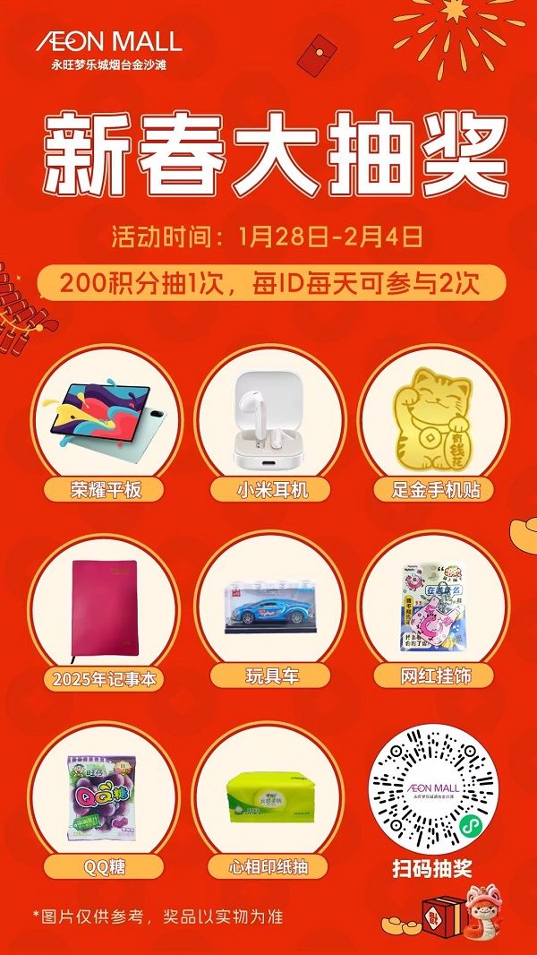 同时,“新春大抽奖”活动也将同步进行。消费者只需登录永旺梦乐城会员小程序,消耗200积分即可参与幸运大转盘抽奖,平板电脑、小米耳机等大奖等您来拿。