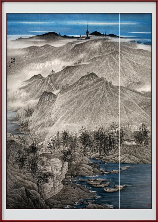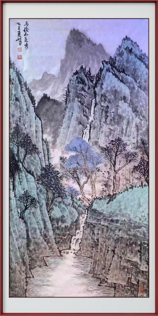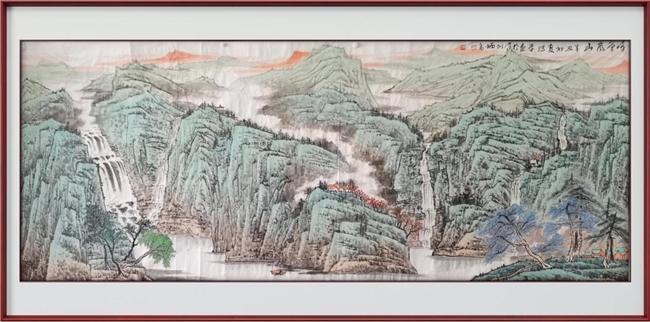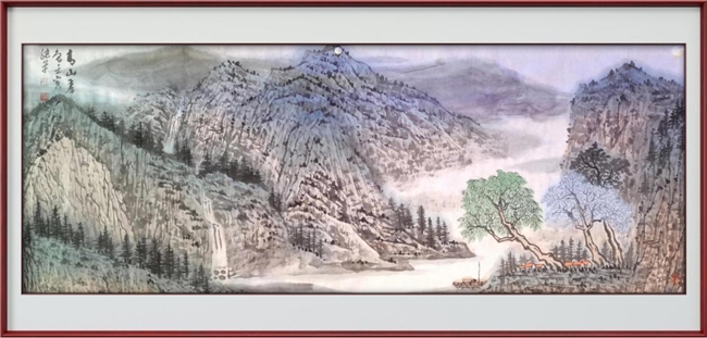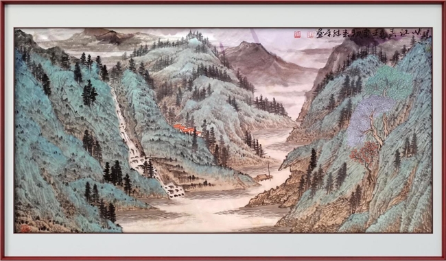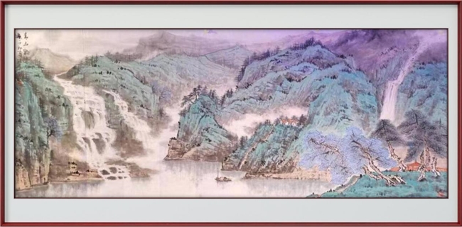就作品来说,他的山水画是继承了宋元青绿浅绛山水的体貌,作品古朴而不失典雅,鲜明中又有沉着,流丽悦目,充满了东方审美内在的性灵气质,但作品中的线条勾勒,并不是俗笔粗拙的风格,取而代之的是高雅清泊的文人笔线。古人云,山水切不可失笔墨二情,这二情即是笔情与墨情,而为何此二情如此重要,是因为山水画的一切元素,都有赖于笔墨二情的滋养,通俗点讲,这二情就是由法而化,雅韵自然,通向山水文化境界的艺术桥梁,而这桥梁的质量和优劣,便一幅山水画成败的关键,他的笔墨二情是高质量高水准的,自然是气韵生动,赏心悦目。