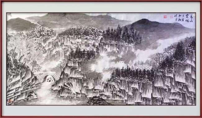 山水画不仅笔墨讲感觉,构图章法也是一样也要讲感觉。作为大幅的山水画作,其作品山水瀑布,树木桥梁、屋宇楼阁,均为俱全,可谓繁复,画面的视野亦是非常开阔,似平视兼加俯瞰,画中灵动的大片青绿,是既像山峦又像云气,宛如飘动于层峦叠嶂之中,使作品愈加邃远而空灵,整幅画作真是酌奇而不失其真,玩华而不坠其实,如此的布局技法,堪称是完美的驭繁之术,以繁而不乱,在似与不似之间中取胜,既不欺世,也不欺人,由此来说,王继平把握山水结构的深度和火候,是令人信服的。