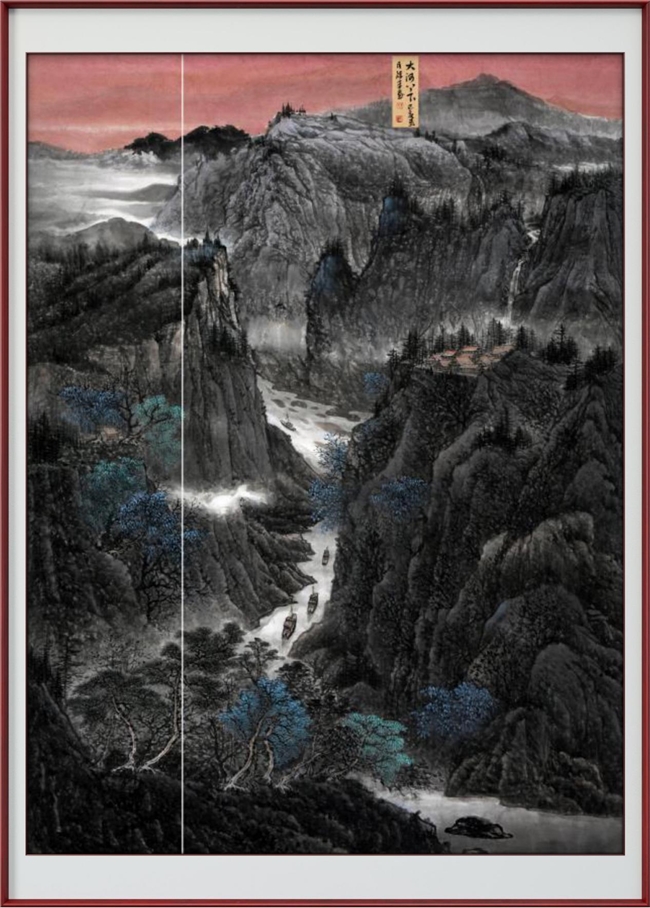 山水墨色与颜色,历来是不以深浅为难,而是难于墨色相和。品赏王继平的山水墨色,很显然,其墨色已然是被他做到了极致唯美,整个画作赋色尤为和谐,不论是从远景,还是中景,再到近景,其青绿与水墨皆是相融自然,色不碍墨,墨不碍色,颜色由淡渐浓,空远性灵。或用浅朱砂石绿点色,突出质感,渲染位置得当,颜色突出了清新立意,此举既能产生墨色对比,又能使画面过渡自然,真是轻艳而不俗气,很自然,有妙趣。不仅如此,画中近景的用色稍显绚烂,也完美地消解了山峰因浓墨焦墨而产生的沉闷感,借古开今,王继平有古法在手,亦是何愁墨色颜色的万般变换?
