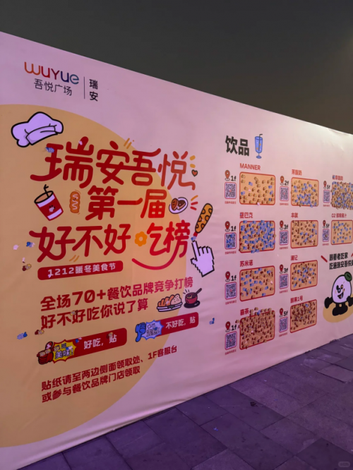 “在12月,给餐饮界来一点小小的民心反馈!”本月,瑞安吾悦广场发起首届“好不好吃榜”全民打榜活动。在2-3号门连廊处,一张集结全场70余家餐饮品牌的“美食民意墙”正式亮相,顾客可通过红、蓝贴纸进行实名投票——红色代表“好吃”,蓝色代表“报吃”,以最直观的方式汇聚舌尖上的真实评价。