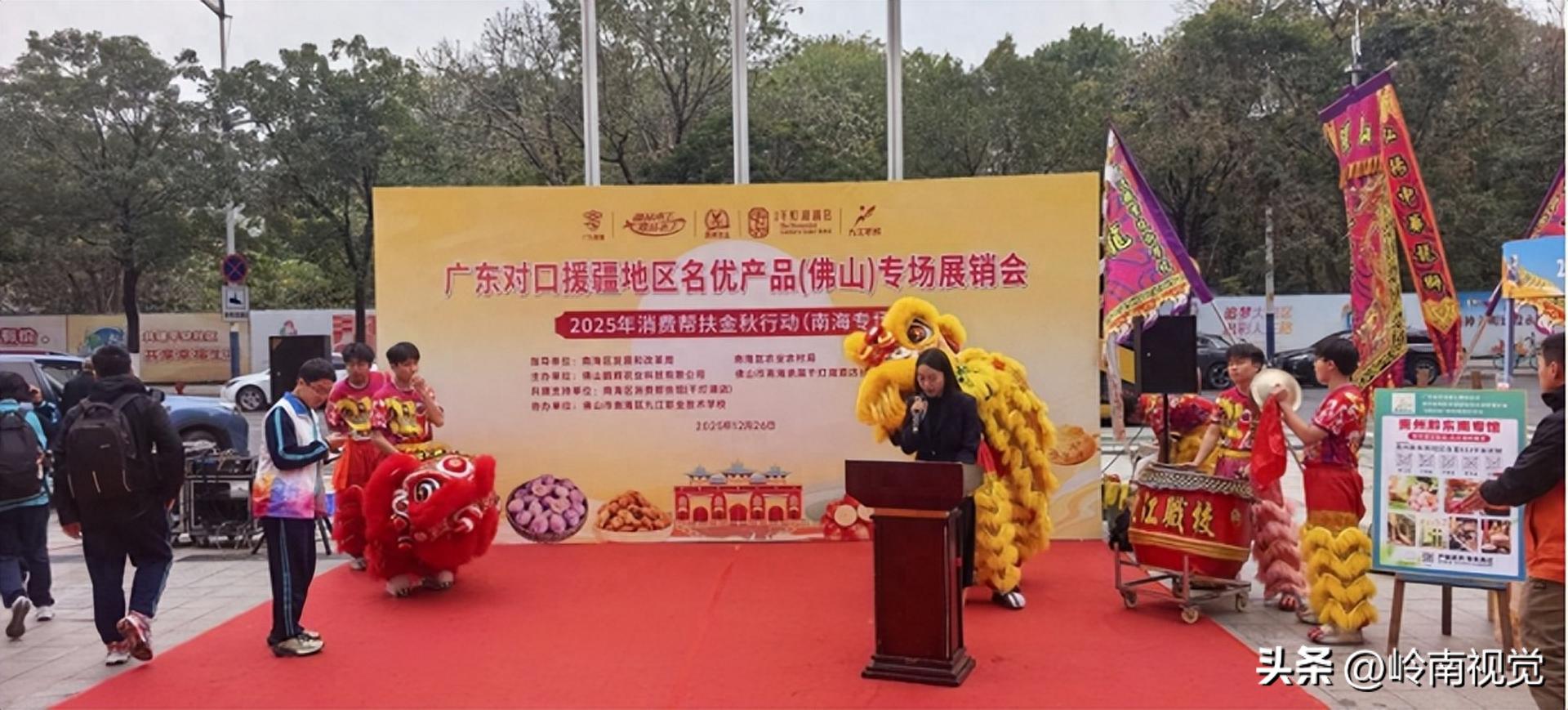 锣鼓喧天庆盛会,疆粤同心暖寒冬。2025年12月26日,由南海区发展和改革局、南海区农业农村局指导,佛山鹏辉农业科技有限公司、南海承展千灯湖酒店联合主办,南海九江职业技术学校协办的广东对口援疆地区名优产品(佛山)专场展销会暨2025年消费帮扶金秋行动(南海专场),在南海承展千灯湖酒店广场正式拉开帷幕。本次活动以“消费帮扶助农增收、金秋优品惠享南海”为主题,创新融入“产教协同助帮扶”模式,通过“特色展销+非遗展演+校园直播+美食体验”的多元形式,让新疆优质特产与佛山本土文化深度交融,为深化粤疆协作、拓宽消费帮扶路径注入全新活力。